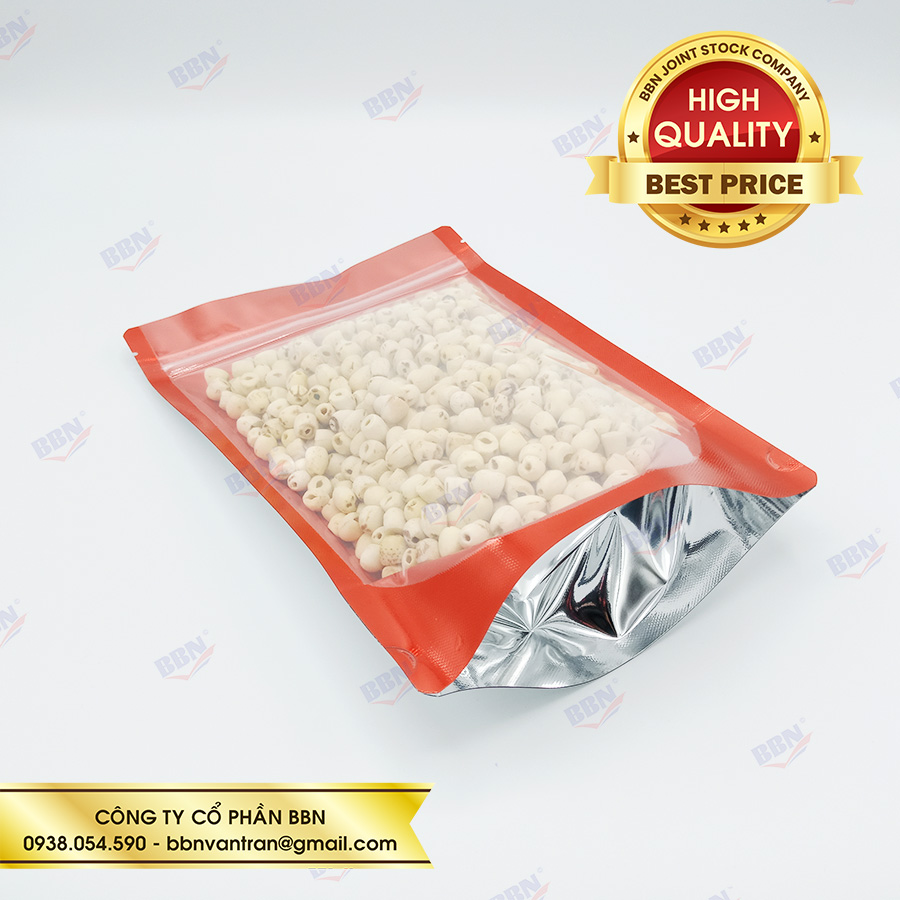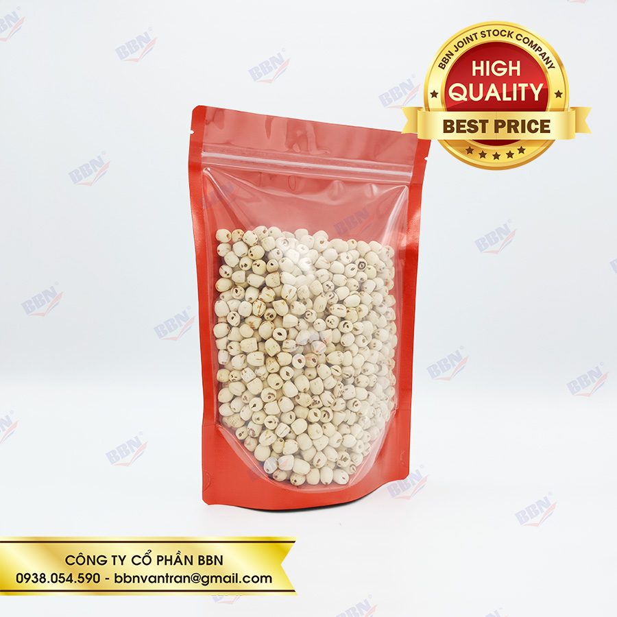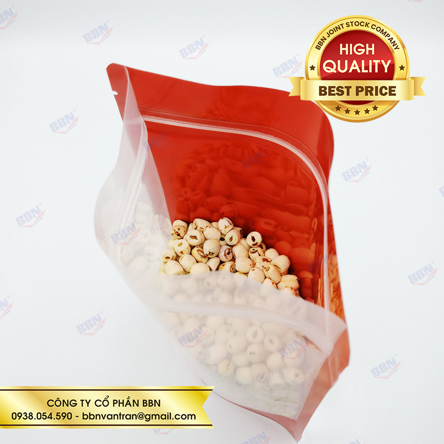 Túi đáy đứng: Bảo quản và trưng bày sản phẩm của bạn hiệu quả với 1 mặt trong suốt thể hiện rõ sản phẩm bên trong, một mặt đỏ sang trọng, sạch sẽ.