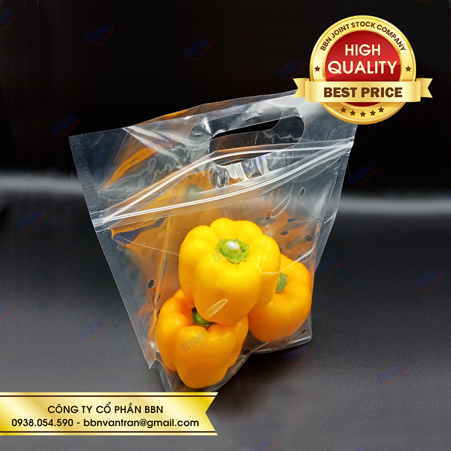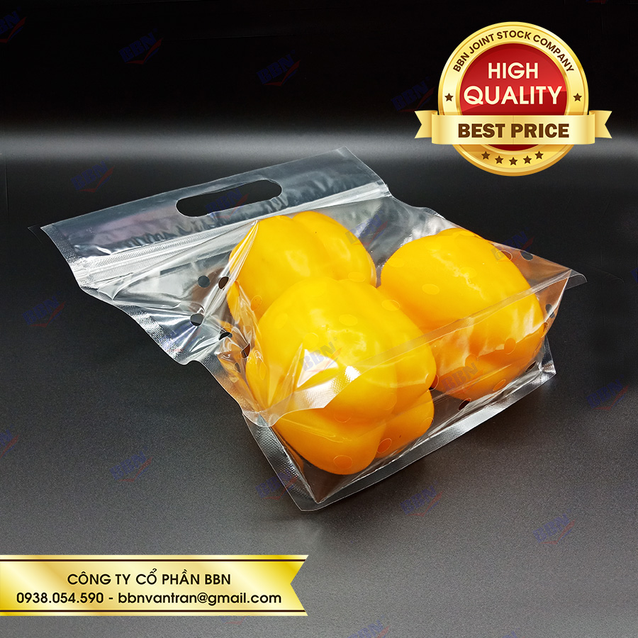 Thiết kế: zipper, đáy đứng mở tròn, đục lỗ thông hơi, quai xách trong suốt.